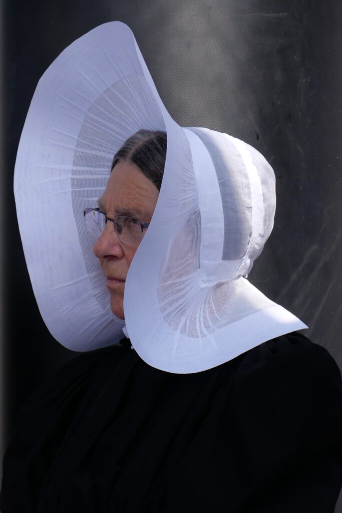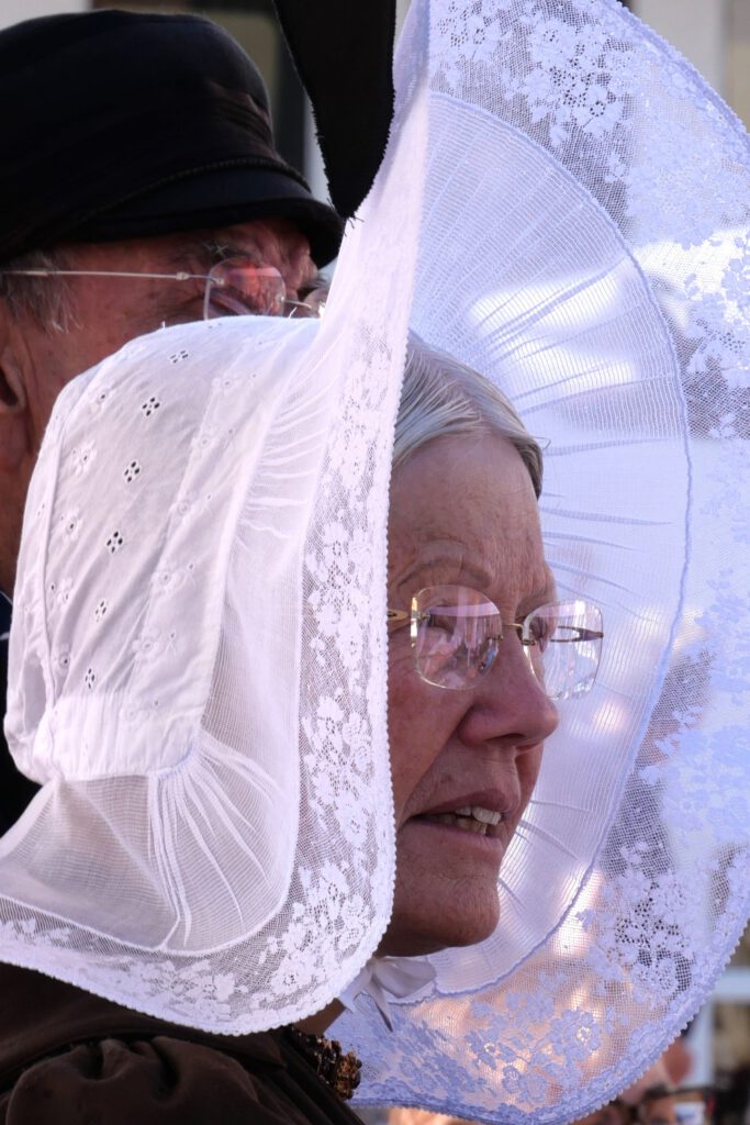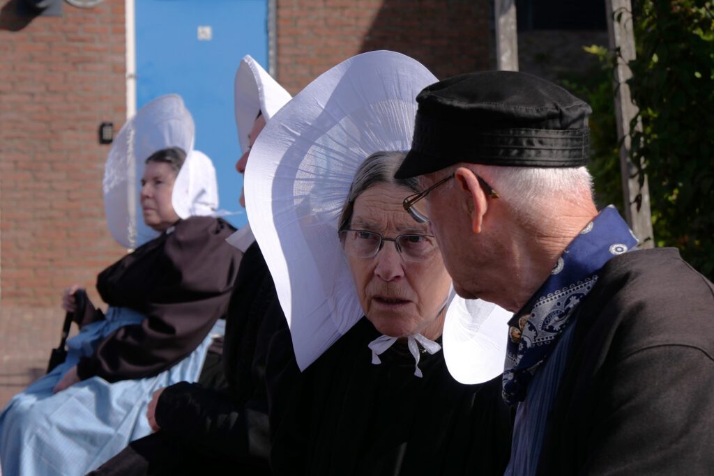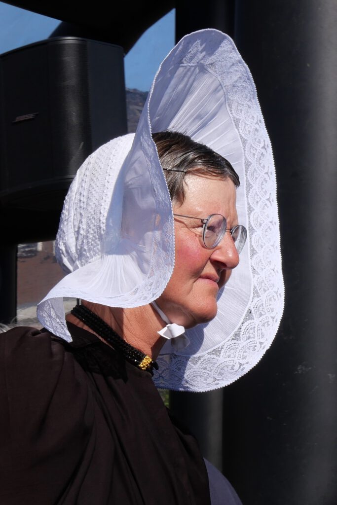 Huizen Deze hoge luifel werd pas na 1920 gedragen, tot 2006. Goud en kant is uit de rouw. Hieronder is de rouwdracht te zien. Zilver en met hangers aan de kap. De man had een gebreid befje. Elke familie had zijn eigen motief.