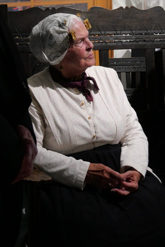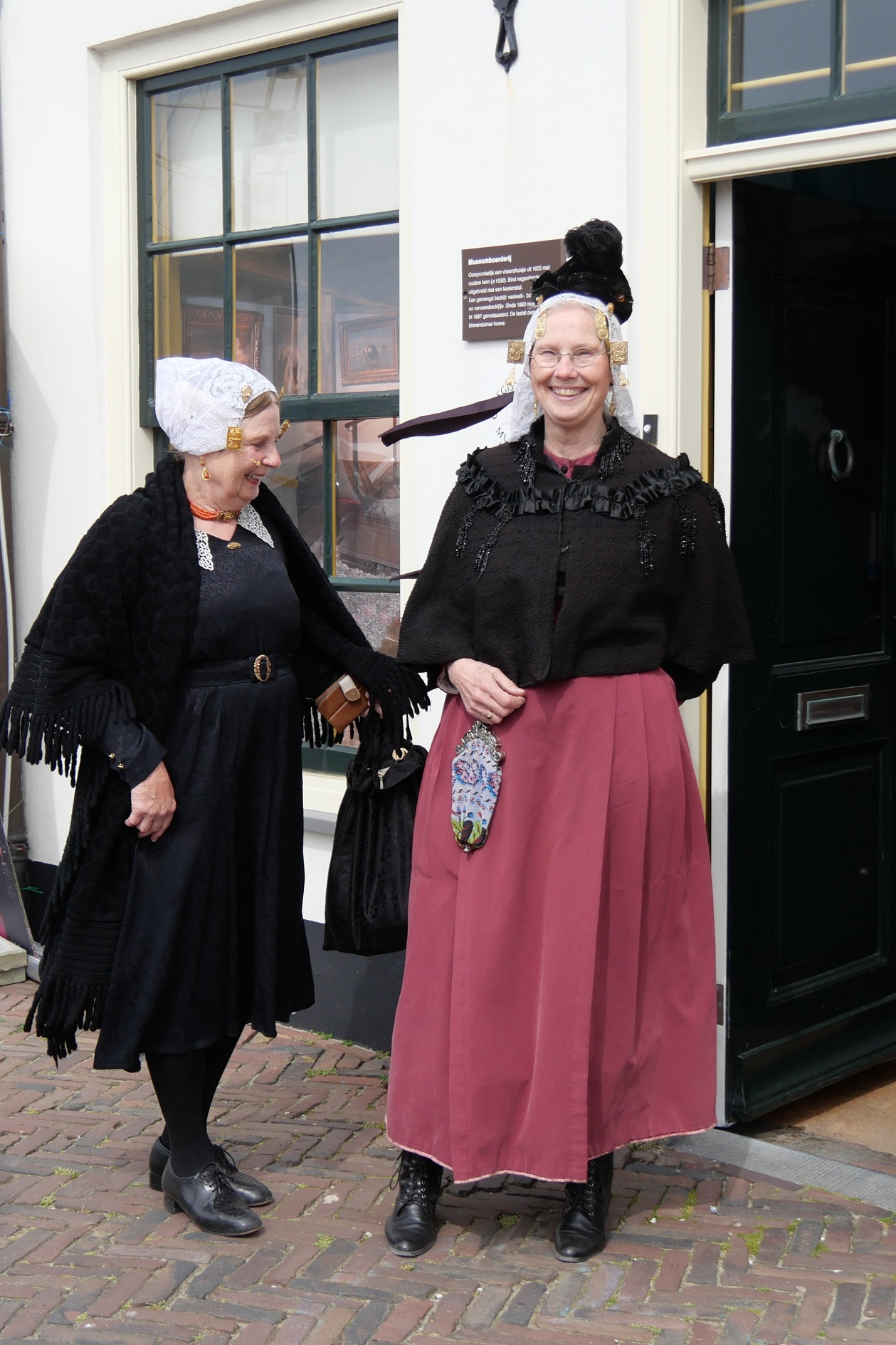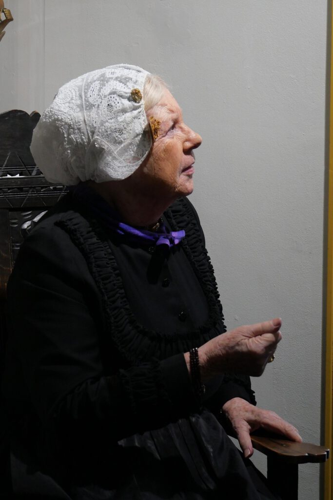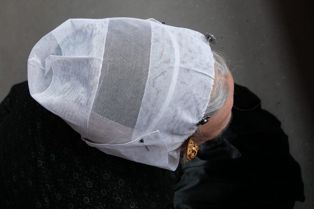 Een zwart mutsje met een elastiek erover. In Noordwijk Zee (protestant) zitten de flappen van de muts tegen het hoofd aan.